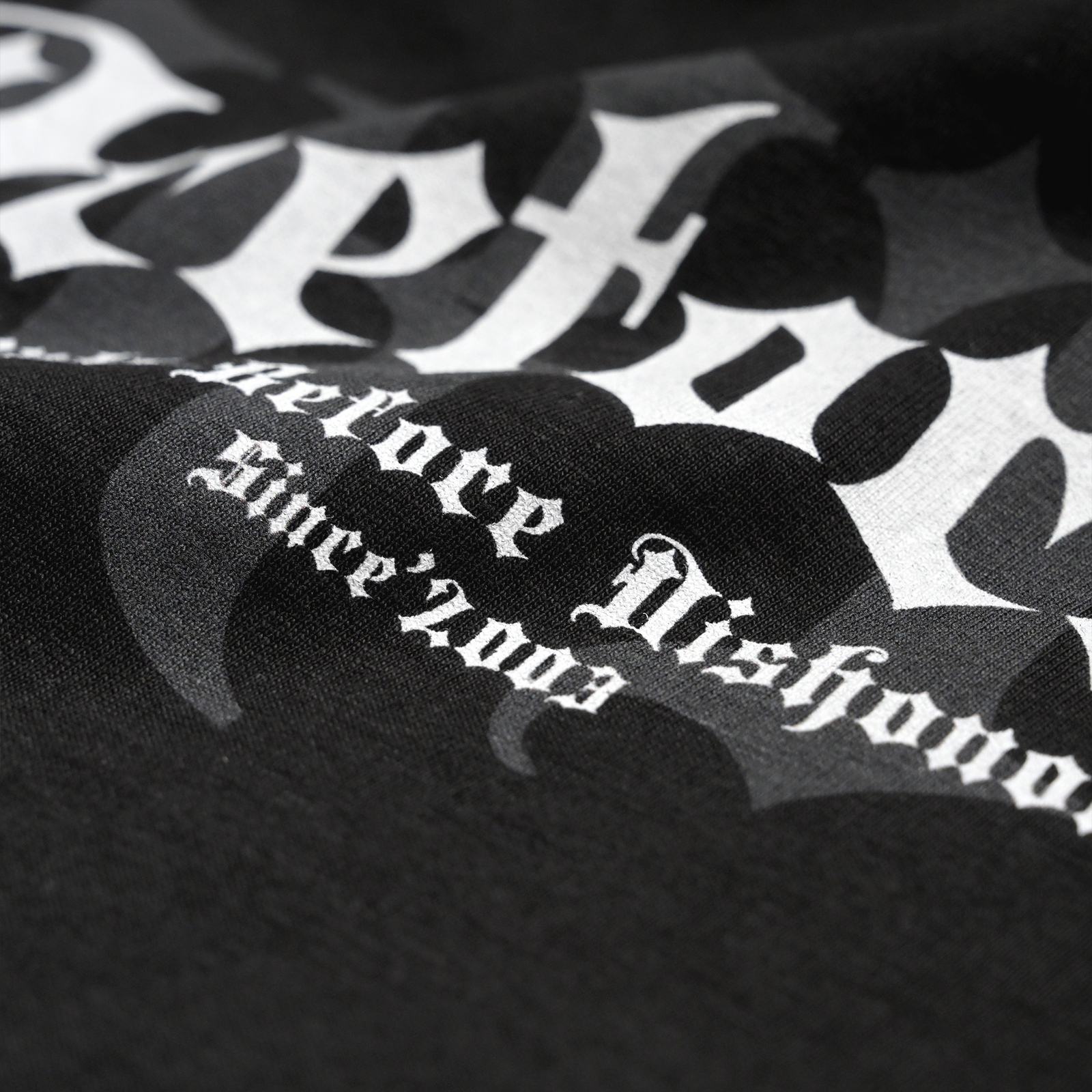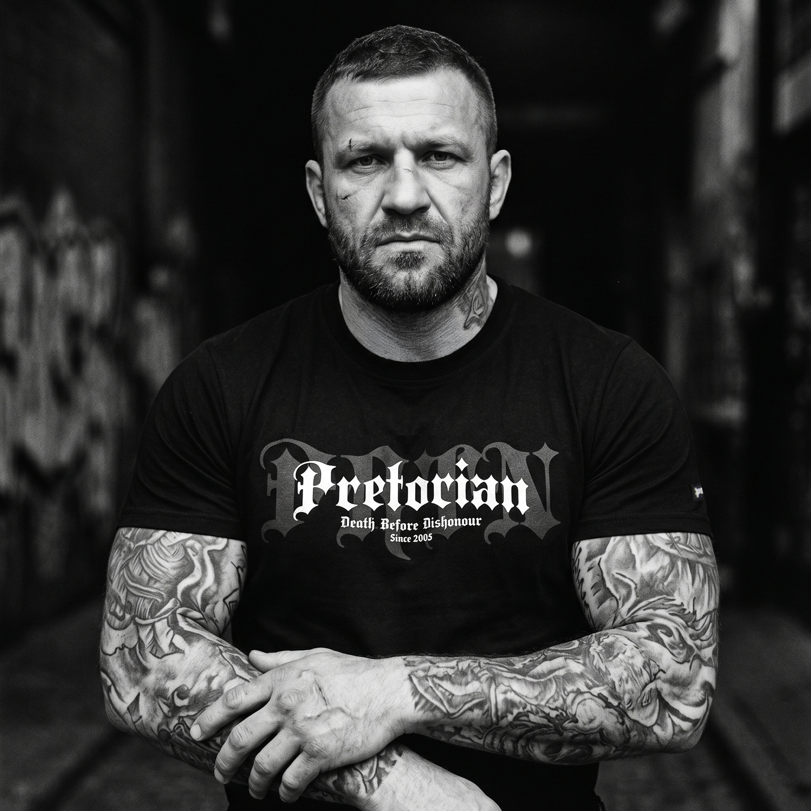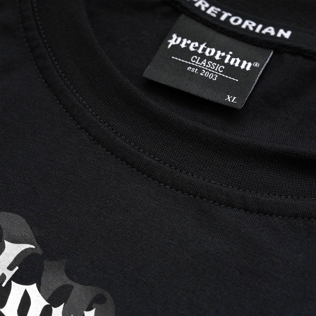 Centralnym punktem tego modelu jest duży, biały nadruk na piersi, wykonany w charakterystycznej dla marki Pretorian gotyckiej stylistyce. Grafika przedstawia nazwę marki, a pod nią znajduje się mniejszy napis "Death Before Dishonour" oraz mniejsza data "Since 2003", podkreślając historyczny i bezkompromisowy charakter marki. Ten agresywny nadruk nadaje koszulce unikalny, uliczny charakter i sprawia, że nie pozostanie ona niezauważona.